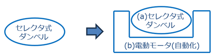 ’771特許は、一言で言えば、セレクタを人間が操作するようなマニュアル式の従来の構成を、電動モータによって自動化したシステムであり、クレーム1の構成で表現すれば、「(a)セレクタ式ダンベル」を、「(b)電動モータ」で自動化したシステムと言えるでしょうか(下図参照)。