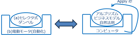 地裁は、問題のクレームの本質は以前から人間が行ってきたスタッキング調整というプロセスを単に電動モータで自動化した点にあるに過ぎず、これは、最高裁判例が示すようなプロセスの単なる自動化と変わらないと解釈したのでしょう。最高裁判例に関わるプロセスとは、たとえば、数学的アルゴリズムやビジネスモデル、自然法則といった司法例外であり、このような司法例外に、コンピュータを単に適用(apply)するようなケースについて、最高裁判例は繰り返し特許適格性を否定してきました。しかしながら、本事案で地裁がプロセスとして注目した対象は、セレクタ式ダンベルという構造物であり、それ自体は抽象概念(司法例外)ではありません(下図参照)。