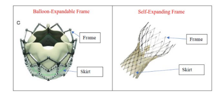 本件特許の対象である経カテーテル大動脈弁置換術用のデバイスは狭径に収縮し、デリバリーカテーテルを介して患者の病変部まで送られることが当該技術分野において知られています。病変部に到達すると、デバイスはカテーテルシースから取り出され、以下の2つの方法のいずれかで拡張され、所定の位置に固定されます。1つ目の方法は、「バルーン拡張型フレーム(Balloon-Expandable Frame)」を介して拡張する方法であり、これは、デバイス中央でバルーンを膨張させることで収縮状態から展開状態まで拡張することを必要とするフレームです。2つ目の方法は、「自己拡張型フレーム(Self-Expanding Frame)」を介して拡張する方法であり、自己拡張型フレームは、デリバリーカテーテルから放出された後、形状記憶材料によって拡張し、元の形状に戻ります。これら2種類のフレームを以下に示します(左側が「バルーン拡張型フレーム」、右側が「自己拡張型フレーム」)。