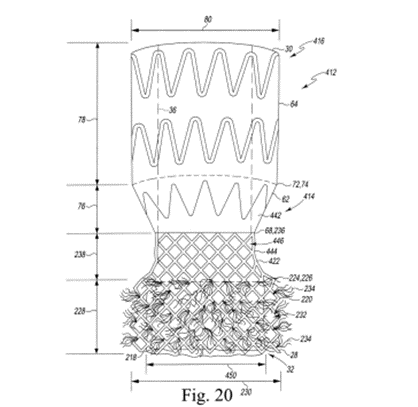 明細書においては図20について議論する際に、416で示された構成要素を「外側フレーム」と複数回呼んでおり、「外側フレーム416はポリマー材料から形成されてもよいことを理解されたい。」とも記載しています(’735特許の第17コラムの第65行~第66行)。また明細書では、416で示される構成要素を「自己拡張型フレーム」または「自己拡張型外側フレーム」と複数回呼んでいます。たとえば明細書は「二重フレーム414は、自己拡張型の外側フレーム416と、自己拡張型の外側フレーム416に固定され弁32を収容するバルーン拡張可能な内側フレーム218とを含む。」と記載しています(’735特許の第17コラムの第58行~第61行)。