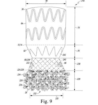 一方、明細書は、図9について議論する際に、216で示される構成要素を「外側フレーム」と複数回呼んでいます(例えば、「外側フレーム216は、細長い近位セクション220を含む…」という記載(’735特許の第12コラムの第20行~第23行))。また、216で示される構成要素を「自己拡張型フレーム」または「自己拡張型外側フレーム」と複数回呼んでいます(例えば、「図9を参照すると、自己拡張型外側フレーム216は、概ね砂時計の形状を有する…」という記載(’735特許の第12コラムの第14行~第18行)、「自己拡張型フレーム216の外側に先細りした中間部62は…」という記載(’735特許の第12コラムの第64行~第67行))。